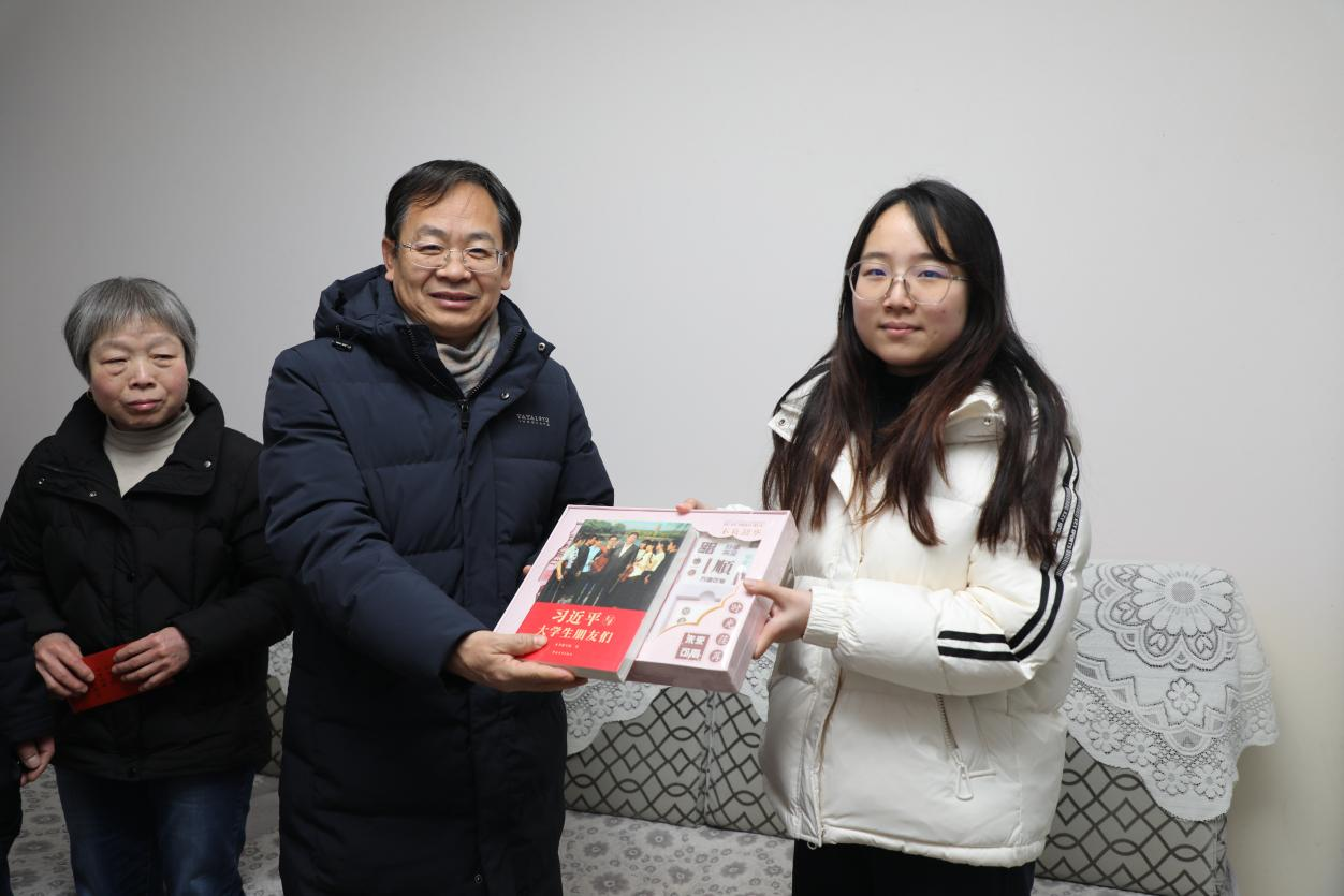 家访现场,校长郭秋平、副校长米立伟一行与赵思雨同学及家长促膝谈心,详细询问其母亲治疗进展、家庭情况及学业规划,为学生送上《习近平与大学生》书籍及学习用品,并代表学校送上1000元爱心资助金,将学校的关怀与温暖实实在在送到了学生和家长身边。